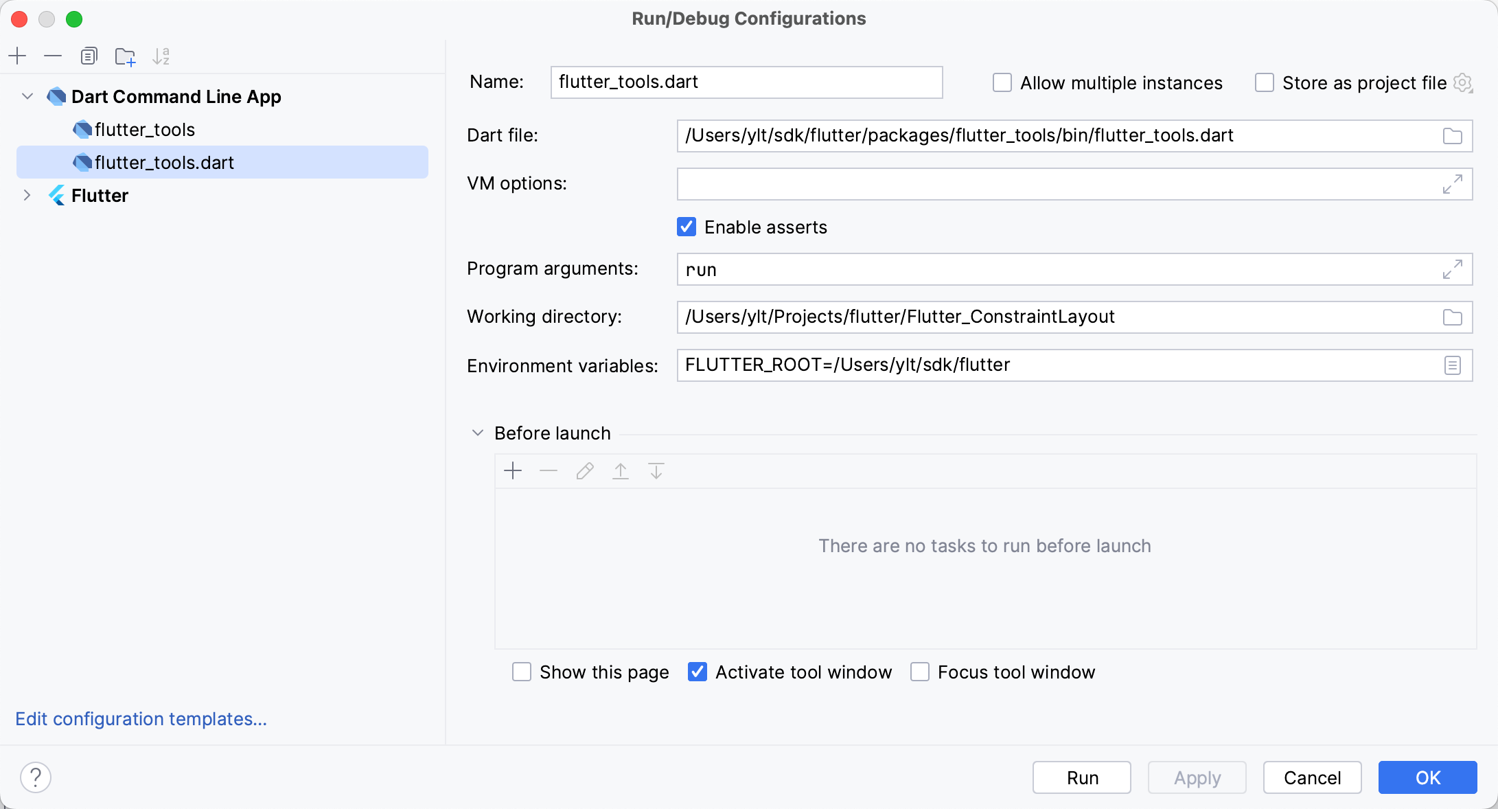 bin/cache/flutter_tools.snapshot让修改生效(会强制重新构建flutter tool) - Android Studio 中选择 configuration ,新建一个 “Dart Command Line App”,”Environment Variables” , 输入